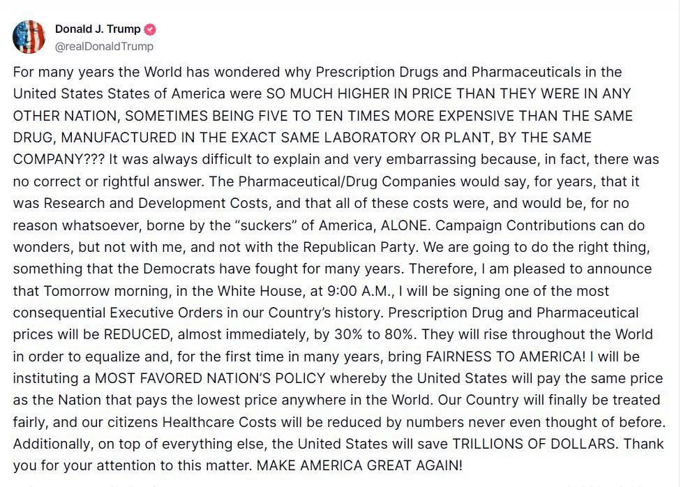 今日生技界的大新聞:川普提出「最惠國」(Most Favored Nation, MFN)藥價政策,打算將美國藥品價格與其他國家的最低價格掛鉤,希望藉此壓低國內藥品支出。
