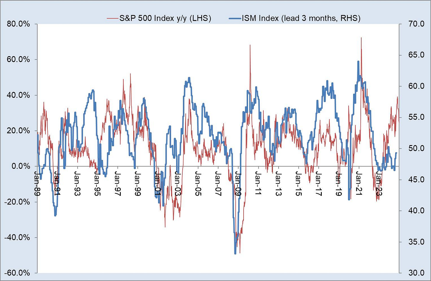 1. 歷史驗證的穩定性:這張圖涵蓋近35年(1989-2024),多次經歷景氣循環,證明了ISM Index與S&P500年變化率的強相關性。
