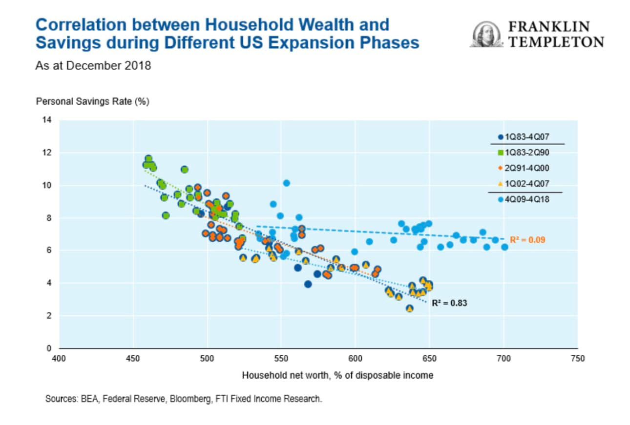 5. 透過歷史數據發現,儲蓄率與「家戶淨資產對可支配所得的倍數」高度相關(如下圖,相關係數 > 0.8)。也就是說,當股票與房市上漲,家戶會更願意消費,儲蓄率降低,進而推動 GDP 成長以及企業利潤上升,然後可能又對股票市場有正面影響。